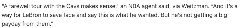 “加盟骑士然后进行告别巡回赛,这是合理的,这也是勒布朗保全面子并说明这就是他想要的方式,但他应该不会从骑士那里得到大合同。”这位高管如此说道。
